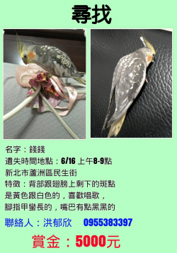 尋找鸚鵡~錢錢 地點 新北市蘆洲區 Luzhou , New Taipei ,Parrot