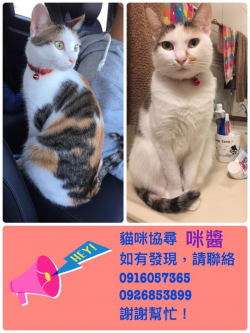 尋找貓咪~咪醬 地點 桃園市中壢區 Zhongli , Taoyuan 【尋找貓咪~咪醬 地點 桃園市中壢區】 轉貼內容尋貓啟事名字:咪醬品種:米克斯(三花)走失地點:中壢馬祖新村附近5/14晚上7點多自己開門出去,平常如果偷溜成功頂多是幾小時就回來了,但這次已經過了二個晚上還…https://twpetsearch.arlinks.net/2019/05/zhongli-ta...... [閱讀更多]