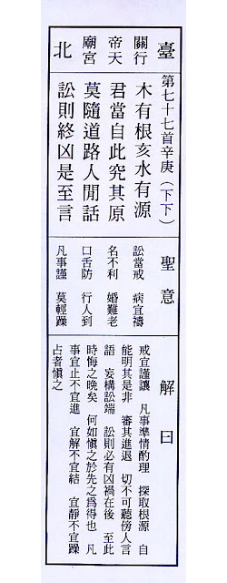 木有根荄水有源 君當自此究其原 莫隨道路人閒話 訟則終凶是至言 (則字,另有改作到字一說) (荄音同該字,是草根之意,常被誤繕為亥字) 聖意一 訟當戒。病宜禳。名不利。婚難老。 防口舌。行未到。凡事謹。莫輕躁。 聖意二 訟當戒。病宜禱。名不利。婚難老。防口舌。行人到。凡事謹。...... [閱讀更多]