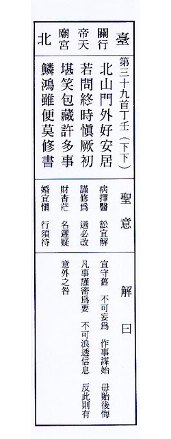 北山門外好安居 若問終時慎厥初 堪笑包藏許多事 鱗鴻雖便莫修書 (外字,另有改作下字一說) 聖意一 病擇醫。訟宜解。求財無。圖名旡。 婚宜審。行須待。謹修為。過必改。 聖意二 病擇醫。訟宜解。謹修為。過必改。財杳茫。名遲疑。婚宜慎。行須時。 東坡解一 靜處安身。不堪比匪。欲保終吉。作事謹始。 無感人言。...... [閱讀更多]