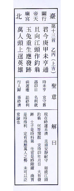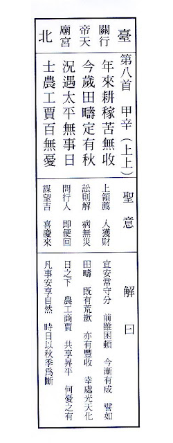 年來耕稼苦無收 今歲田疇定有秋 況遇太平無事日 士農工賈百無憂 聖意一 士領薦。人獲財。訟即解。病無災。 問行人。即便回。謀望吉。喜慶來。 聖意二 士領薦。人獲財。訟則解。病無災。 問行人。即便回。謀望吉。喜慶來。 東坡解 凡事求謀。昔否今泰。時運將亨。有...... [閱讀更多]