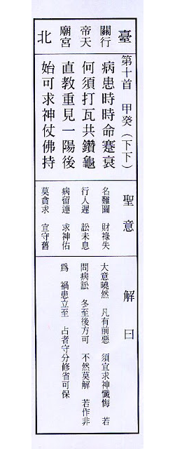 病患時時命蹇衰 何須打瓦共鑽龜 直教重見一陽後 始可求神仗佛持 (後字,另有改復字一說) 聖意 名難圖。財祿失。行人遲。訟未息。病留連。求神佑。莫貪求。宜守舊。 東坡解一 命運多蹇。疾病連綿。但宜修省。託庇蒼天。直須冬至。禱神方痊。凡百謀望。作事必全。 東坡解二 ...... [閱讀更多]