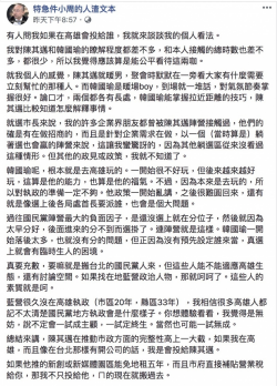 高雄市長選情全國注目,筆名「人渣文本」的輔大教授周偉航在臉書發文分享見解,表示陳其邁在推動市政的完整性高。(圖/翻攝臉書) 近日高雄市長選舉已成為全國注目焦點,筆名人渣文本、在輔大哲學系任教、於網路上擁有高人氣的周偉航,在臉書上發文表示「會投給陳其邁」,引發熱議。 周偉航說,「對陳其邁和韓國瑜的瞭解程度都差不多,所以應該算是能公平看待這兩...... [閱讀更多]