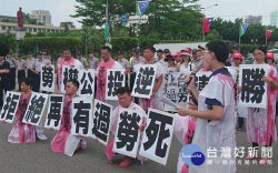(圖/翻攝 市縣政府機關環保工會聯合會臉書) 總統蔡英文就任滿兩週年,勞團勞權公投聯盟今天走上凱道怒吼心中的不滿,重砲抨擊蔡英文選前宣稱「勞工是民進黨心中最軟的一塊」,選後還「2次修惡勞基法」。並以「過勞惡法,害死勞工!」為主題,上演行動劇,勞團穿著過勞衣躺在凱道上,象徵過勞、血汗,嘲諷「政府上台2年,讓勞權倒退30年」。呼籲民眾參與勞權公投,...... [閱讀更多]