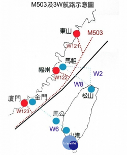 中國未先與台灣溝通,日前逕自啟用M503由南向北航路及W121、W122、W123等3條航路,引發我國領空威脅疑慮。(圖/陸委會提供) 先前交通部民航局宣布,今(2018)年春節兩岸共加開256班次飛機,從1月3日起也陸續核准航空公司之春節加班機申請。我國籍航空公司中華航空、長榮航空,也開放今年兩岸春節加班機的訂票服務。不過為反制中國片面啟用M...... [閱讀更多]