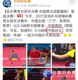 撞球賽搞小動作! 央視將「中華台北」變「中國台北」(圖/翻攝網路) 台灣參加國際體育賽事,屢遭中國打壓,現在連稱謂也被「惡搞」!2017年亞洲撞球錦標賽日前於中國無錫開打,大陸央視報導台灣代表相關賽事時搞小動作,擅自將「中華台北隊」改成「中國台北隊」,之後多家中國官媒也同樣跟進,甚至連賽事直播時右下角名稱也被動手腳「更換隊名」。陸媒分析指出,央視此舉...... [閱讀更多]