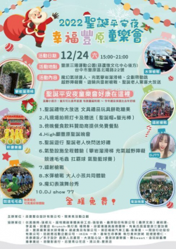 消費中心/綜合報導 聖誕節是個充滿幸福與溫馨的節日,適合與親友齊聚,分享彼此的歡樂與喜悅。今年的12/24平安夜適逢週六,正好讓民眾相揪在假期歡慶耶誕節。 今年還沒安排活動的中台灣朋友們,不妨去台中豐原三陽運動公園參加「2022聖誕平安夜幸福豐原童樂會」,活動時間從下午3點一直到晚上9點,現場有充氣攀岩溜滑梯、越野槍戰及聖誕好禮大放送等精彩活動,非常適合闔家大小同樂!最棒的是傍...... [閱讀更多]