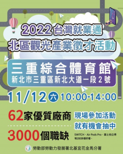 消費中心/綜合報導 因應新冠疫情趨緩,旅遊觀光業復甦,勞動部勞動力發展署北基宜花金馬分署為協助轄區觀光、旅宿及餐飲業者補實人力,將於111年11月12日(六) 10:00-14:00在三重綜合體育館舉辦「2022台灣就業通北區觀光產業徵才活動」;本場活動由北分署、臺北市就業服務處及新北市政府就業服務處共同邀集轄內62家星級酒店與指標性觀光餐飲業者,釋出3,000多個優質職缺讓民眾求...... [閱讀更多]