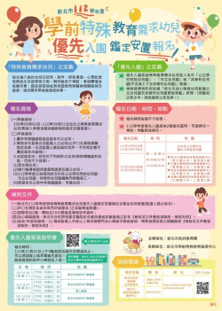 記者黃俊育 / 新北報導 新北市辦理112學年度學前特殊教育需求幼兒優先入園鑑定安置,凡設籍新北市的幼兒,學齡滿2至5歲(110年9月1日~106年9月2日間出生者),領有身心障礙證明、鑑定醫院綜合報告書或診斷證明,幼兒發展與同年齡孩子相較明顯落後或具異常特殊狀況需要特殊教育服務者,均可提出申請,鑑定安置報名時間從111年12月1日至30日。 教育局表示,為落實特殊教育向下延伸...... [閱讀更多]
