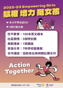 圖/文 國際扶輪提供 聯合國於2011年公佈10月11日為國際女孩日International Day of the Girls Child,有鑑於此,國際扶輪3482地區結合賦權女孩、小紅帽、法治教育等委員會,透過社友與社區結合,推出5個競賽獎金活動,號召大家一起推廣賦權女孩、培力女孩的新理念。 國際扶輪3482地區總監徐錕柏表示:今年國際扶輪社長Jennifer Jones乃是...... [閱讀更多]