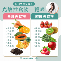 記者黃宣瑄/綜合報導 雖然逐漸進入秋季,但秋老虎的威力仍不可忽視,陽光曬起來仍非常可怕! 營養師朱瑞君也在臉書粉絲專頁「輕鬆瘦營養師 朱瑞君」中發文提醒,夏季是光敏性皮炎的高發季節,手臂、小腿、臉部等裸露在外的皮膚都是易發部位。 圖/翻攝自輕鬆瘦營養師朱瑞君 營養師朱瑞君也分享「吃了容易曬黑的」光敏性食物,葉綠素含量高的蔬菜和野菜都屬於光敏性食物,如萵苣、莧菜、薺菜、芹菜、...... [閱讀更多]