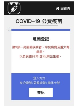 疫苗預約平台意願登記,13日開放第9類實施對象再擴大,開放第9類(19至64歲高風險、罕見疾病及重大傷病者)及民國92年(含)以前出生者,18歲以上的人都可以登記接種疫苗的意願,預約登記頁面,有AZ及莫德納兩種疫苗可以複選。 13日開放第9類實施對象再擴大,第9類(19至64歲高風險、罕見疾病及重大傷病者)及民國92年(含)以前出生者,18歲以上的人都可以登記接種疫...... [閱讀更多]
