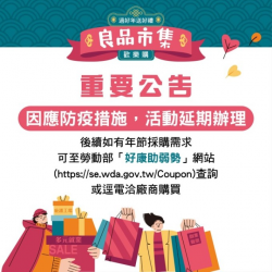 國內疫情拉警報,勞動部勞動力發展署桃竹苗分署為配合桃園市政府強化防疫措施,原訂本周六1月8日在桃園市中壢區銀河廣場舉辦「過好年送好禮,良品市集歡樂購」聯合推廣活動,將延期辦理。 原訂1/8在中壢區銀河廣場舉辦「過好年送好禮,良品市集歡樂購」聯合推廣活動將延期辦理。圖:桃竹苗分署提供 桃竹苗分署長賴家仁表示,本次活動配合防疫措施延期辦理,然農曆春節將近,仍鼓勵民...... [閱讀更多]