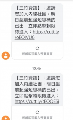 台北股市交易熱絡引起詐騙集團的覬覦,推薦飆股等投資詐騙案件激增,金管會因此也呼籲投資人投資理財前務必提高警覺,審慎判斷投資訊息。國內行動股票看盤軟體龍頭三竹資訊(8284),近日也受投資詐騙簡訊波及,有不肖人士假冒【三竹資訊】名義,大量隨機發送投資簡訊,誘使投資人加入Line意圖騙取民眾錢財。 近期炒股詐騙簡訊異常多,三竹資訊遭冒名已報警處理,圖:諶志明翻攝 據悉,...... [閱讀更多]