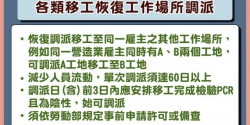 中央流行疫情指揮中心19日表示,國內疫情已較為穩定,為兼顧國內妥善安排人力及實務上業務需求,自7月20日起恢復移工調派至同一僱主之其他工作場所。至於工作延伸(即僱主指派移工至客戶契約履行地工作),考量移工流動性較高及染疫風險,仍暫緩解封,未來將視疫情再行檢討。 7/20起移工恢復可變更工作場所,單次調派需達60日以上。圖:疾管署提供 指揮中心說明,近期評估國內...... [閱讀更多]