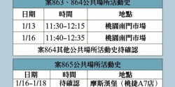衛福部立桃園醫院一週內爆發群聚感染事件,目前已有五名醫護人員確診新冠肺炎,19日再新增六例個案,包含四例本土(864、865、868、869)、兩例境外移入(案866、867),其中,案864與先前確診的案863為夫妻,足跡疫調顯示1/13日上午11點30分到12點15分及1/16上午11點40分~12點35分曾兩度到過桃園南門市場,另案865在桃園機捷A7站內的摩斯漢堡...... [閱讀更多]