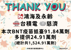 最後1批BNT疫苗91.84萬劑抵臺 郭台銘:捐贈已圓滿 | 桃園電子報