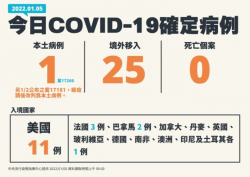中央流行疫情指揮中心5日下午召開新冠肺炎防疫記者會,會中指揮官陳時中公布國內新增26例COVID-19確定病例,分別為1例(案17266)本土及25例境外移入,另確診個案中無新增死亡。 桃機群聚再添一例,國內1/5再增25例境外移入。圖:指揮中心提供 陳時中說明,案17266為本國籍50多歲女性,已接種2劑莫德納疫苗為突破性感染,與案17230、17238及案...... [閱讀更多]