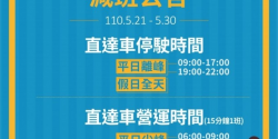 新冠肺炎疫情嚴峻,桃捷公司因應全國三級警戒,以及全國各級學校停課等措施,導致民眾搭乘機場捷運需求減少,經桃捷公司審慎評估疫情變化及旅客需求後,將於5/21至5/30實施離峰時間(上午9點至下午5點,下午7點至晚上10點)直達車不運行短期措施。由現行平日直達車95趟次調整為55趟次(假日則全時段為離峰時間)普通車則維持現有時刻表,以維持服務搭乘機場捷運通勤旅客,詳細時刻表請...... [閱讀更多]