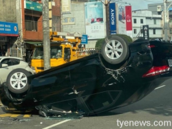 【有片】汽車失控地板抓不住 自撞安全島翻跟斗