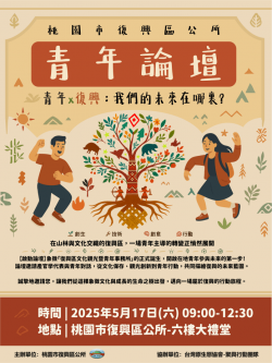 2025桃園市復興青年行動計畫暨青年論壇將於明(17)日上午9時在復興區公所六樓舉行,為「復興區青年行動計畫」正式揭開序幕。此次計畫由復興區公所主辦,並首度結合由在地青年所組成的執行團隊共同規劃與推動,展現復興區對青年政策的重視與實踐。 2025桃園市復興青年行動計畫暨青年論壇將於5/17在復興區公所六樓舉行。圖:區公所提供 區公所表示,...... [閱讀更多]