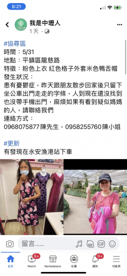 楊梅警分局5月31日接獲報案表示,有1名57歲的梁姓女子沒帶手機,留字條給家人說要外出走走,到了晚上仍未返家,家人報請警方協尋,並在臉書社群上發文尋人,經過連日搜尋,警方於端午節清晨在永安漁港出入口旁的店家門口發現,立即將梁女送醫並通知家人到場團圓。 楊梅57歲的梁姓女子患有憂鬱症又沒帶手機離家,家人報請警方及在臉書社群上發文尋人。圖:讀者提供 楊梅警方在...... [閱讀更多]