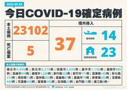 本土確診數再飆增!中央流行疫情指揮中心今(3)日公布國內新增23,139例COVID-19確定病例,分別為23,102例本土個案及37例境外移入,其中14例為航班落地採檢陽性,另確診個案中新增5例死亡。 本土破2萬!5/3新增23102例確診 5人因染疫亡。圖:指揮中心提供 ...... [閱讀更多]
