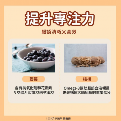 昨(3)日起各行各業陸續開工,歷經9天春節連假,有些人還沒收心,上班時總覺得提不起勁。營養師李婉萍特別在臉書分享6種食物,可幫助大家快速回歸最佳狀態,讓工作更有效率。 吃藍莓、核桃可提升專注力。圖:翻攝自李婉萍營養師 李婉萍表示,想提升專注力,讓腦袋清晰又高效,可以吃藍莓,因為藍莓含有抗氧化劑和花青素,可以提升記憶力與專注力。此外,核桃的Omega-3脂肪酸能幫助腦部血液暢通,...... [閱讀更多]