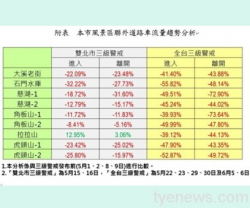 受新冠肺炎疫情影響,中央流行疫情指揮中心5/19發布全台進入第三級防疫警戒狀態後,桃園市政府交通局蒐集市轄主要道路監控設備所偵測之車流量資料發現,各路段交通量皆呈現下降趨勢,尤其以風景區聯外道路車流量降幅超過四成最為明顯。 桃園市風景區聯外道路車流量趨勢分析。圖:交通部提供 交通局長劉慶豐表示,經蒐集大溪老街、石門水庫、慈湖、角板山、拉拉山及虎頭山等風景區聯外...... [閱讀更多]