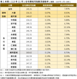 (圖/ 臺南市政府地政局) 根據臺南市地政局最新公布的住宅價格指數,113年11月臺南市住宅價格指數為149.35,較10月微幅上升0.09%,較去年同期則上漲7.85%。不過,整體房市交易量卻大幅下滑,較10月減少16.59%,相較去年同期更是大跌40.40%。其中,安南區的交易量增幅最為顯著,達148.31%。 (圖/ 臺南市政府地政局) 進一步分析各住宅型...... [閱讀更多]