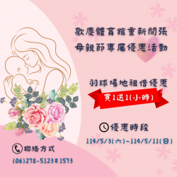 圖/李正翻攝 南部最大聲/記者 李正 台南報導 母親節將至,臺南市新市與歸仁全民運動中心攜手推出暖心運動優惠,讓媽媽在屬於自己的節日裡,不只感受到家人的愛,更擁有健康的體魄。運動中心以「寵愛媽咪、健康加倍」為主題,特別規劃專屬活動,邀請大家帶媽媽一起走出戶外、進入運動空間,為她的健康與快樂注入滿滿能量。 新市全民運動中心於5月11日母親節當天,推出全日限時活動,凡當天到場的...... [閱讀更多]
