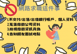 【記者張永漢/高雄報導】畢業潮求職旺季到來,許多年輕人紛紛投入職場,詐騙集團利用社會新鮮人無工作經驗,急於掙錢餬口心態,在網站PO出「輕鬆、領高薪、免經驗、工作彈性」優渥條件,吸引年輕人目光前往應徵,讓被害人誤信找到一份正當的工作後,再藉口詐騙,當發現誤入求職陷阱時為時已晚,才知道自己竟在從事「詐騙」工作。 日前陳同學(95年次) 於社群軟體粉絲專頁(名稱全台北...... [閱讀更多]