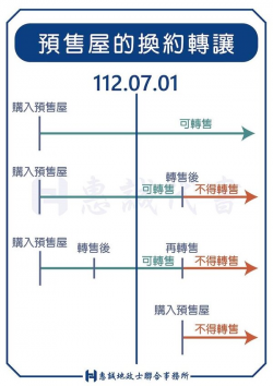 好房網News記者蔡佩蓉/台北報導 《平均地權條例》修正條文,7月1日正式施行,其中,影響預售屋市場最劇烈的「預售屋的禁止換約轉售」就是以7月1日為分界,7月1日之後才購入的預售屋,除非符合6項條件且2年一戶為限,否則就不能換約轉讓;反觀,6月30日前取得的預售屋因不溯及既往,還是可以慢慢找買方。 所謂「預售屋或新建成屋簽訂買賣契約後,不得讓與或轉售買賣契約予第三人」,當...... [閱讀更多]