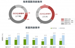 好房網News記者蔡佩蓉/台北報導 國泰房地產指數24日公布2025年第一季數據,全國可能成交價仍季漲0.78%、較去年同季上漲16.52%,成交量指數則季減39.57%,受到銷售率的衰退,雙北地區及桃園市更出現下跌、盤整跡象。 包括桃園市可能成交價季跌3.44%,來到每坪44.78萬元;台北市季跌3.44%,可能成交價為120.41萬元,新北市跌幅為2.00%,可能成交...... [閱讀更多]