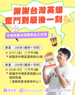 台灣英雄在世界棒球經典賽奮力拚搏的精神,令全檯球迷相當感動,紛紛在社群網站發「祭品文」,希望能為中華隊加油。雖中華隊最後無緣取得前進東京複賽的門票,桃園市議員黃崇真仍將在3月17、18日於中壢區發放總共200份免費的雞排、珍奶。 黃崇真將發放200份免費雞排、珍奶。圖:翻攝自臉書 黃崇真表示,謝謝台灣英雄奮鬥到最後一刻,他將在3月17、18日,連續2天在中...... [閱讀更多]