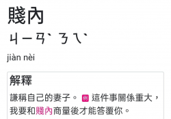 「賤」指的是丈夫本人,而非妻子,因此是一句謙詞,內則是指妻子。圖 : 截圖自網路國語辭典, 記得二十幾年前,也是婚後的第三年,曾向一位女同事介紹了自己的老婆,我說這位是「賤內」,結果對方認為我很不尊重老婆,竟把老婆貶損得如此不堪,甚至用了「賤」字,真是論輕薄而莫此為甚。我當下淡然微哂,並且很認真地說明「賤內」的意思,以期獲得諒解。 相對於崖岸自高,顧盼自雄...... [閱讀更多]
