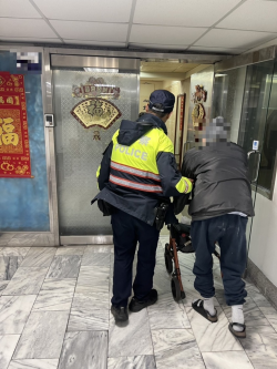 【News586/記者謝福祐報導】 中市警一分局大誠分駐所於113年12月23日16時20分接獲報案,稱在中區臺灣大道一段與興中街口,有一位老翁冒著細雨在車陣中穿梭,情況相當危險。巡佐宋忠信與警員白盛哲獲報後,立即前往現場協助,並成功安全護送老翁返家! 經瞭解,該名林姓老翁(26年次)當日推著助行器在臺灣大道一段與興中街口徘徊,疑似迷路。剛好被路過的熱心民眾察覺異樣,遂報...... [閱讀更多]