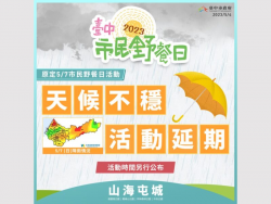 5/7台中市民野餐日 天候不穩將延期舉行 【News586/特派員孫崇文報導】 2023台中市民野餐日原定5月7日(週日)舉行,因中央氣象局預報當日受鋒面通過影響,天氣將轉為陰天,且有短暫雨、雷雨、局部短時較大雨勢機會,考量參與民眾及工作人員安全,台中市政府今(4)日宣布市民野餐日延期辦理,舉辦日期將另行公告。 市府表示,原定5月7日於中央公園、豐原區葫蘆墩公園、清水區鰲...... [閱讀更多]