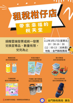 (News586/記者湖明嬛.吳旻高報導) 金門稅務局將於112年3月17日上午10點30分到下午4點30分(中午12點到1點30分休息),舉辦「帶來幸福的-稅天堂」捐發票換宣導品的租稅柑仔店,在稅務局一樓大廳熱鬧登場,歡迎鄉親持112年1、2、3月份雲端發票或紙本統一發票,兌換實用生活用品。 該局表示,「帶來幸福的-稅天堂」提供兌換宣導品有手提餐盒、熱水壺、不銹鋼蒸鍋、瀝水保鮮盒等。...... [閱讀更多]
