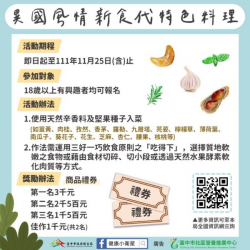 【News586/總社長孫崇文報導】台中市政府衛生局舉辦「異國風情新食代特色料理食譜徵稿活動」,鼓勵各界發揮創意、關注銀髮族健康營養,以天然辛香料取代過量食鹽及味精,認識均衡飲食原則。衛生局表示,徵稿活動即日起至11月25日,活動前五名可獲等值商品禮券,入選的投稿作品可參與精美小禮物抽獎,邀請有興趣的民眾設計出美味兼具高齡友善的餐點。 衛生局長曾梓展表示,依據衛生福利部國民健康署...... [閱讀更多]