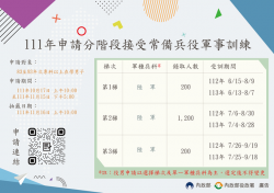 軍事訓練懶人包 【News586/記者彭慧婉報導】 桃園市政府民政局表示,83年次至93年次就讀專科以上學校男子,有意願利用連續2年暑假期間分階段完成4個月常備兵役軍事訓練者,今(111)年10月17日上午10時起到11月15日下午5點止,可於役政署全球資訊網(https://www.nca.gov.tw/)首頁/主題單元/「分階段接受常備兵役軍事訓練系統」提出申請。 111年...... [閱讀更多]