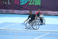 男雙台灣選手廖克松(後)、馬來西亞猛將本約索夫(前)組合(大會提供) 【News586/記者張淑慧報導】「永達盃高雄國際輪椅網球公開賽」今於高雄輪椅夢公園展開第三日賽程,男單4強台灣僅存的輪椅網球一哥戴加揚、陳駿傑都不敵大馬、日本外籍球員而無緣爭冠;所幸男雙決賽將由上一站冠軍戴加揚/唐兆漢與馬來西亞的本約索夫(MOHAMAD YUSSHAZWAN Bin Yusuf)/廖克松的台...... [閱讀更多]