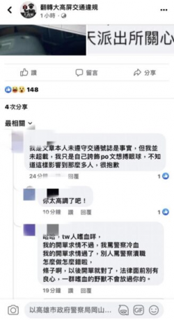 【News586/記者張淑慧報導】岡山分局壽天派出所員警於9月14日11時5分許,見一部超越停止線交通違規之混擬土車,予以上前攔查;惟該部混擬土車輪胎下陷程度不深,員警研判無超重之虞,故依據道路交通管理處罰條例第60條第2項第3款未遵守道路交通號誌標誌之指示當場對駕駛汪姓男子(90年次)製單告發。 事後發現,在「靠北違規」、「翻轉大高屏交通違規」等社群網站上,有民眾張貼「下...... [閱讀更多]