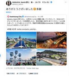 【焦點時報/記者蔡宗武報導】日籍太空人野口聰一近日在推特(Twitter)上,貼出在太空站拍攝的南台灣空拍照。高雄市長陳其邁透過市府新聞局以日文及美照,在推特邀請野口先生疫後親遊港都,感受壯闊山林與海港風情。 野口後來也轉貼高市府的貼文,並表達感謝之意,獲得國內外推友百次分享,新聞局長董建宏表示,推特又在一次扮演高雄在城市行銷及國民外交上的重要角色。董建宏指出,推特(Tw...... [閱讀更多]