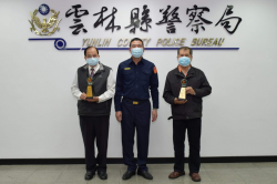 雲林縣警局局長朱宗泰親自頒發琉璃獎座,代表同仁感謝濁水溪書畫學會理事長謝美在(左)及副理事長林志祥(右)/雲林縣警局提供 雲林縣警察局本(1)月6日上午9時舉辦週報,該局除盤點過去一年在治安、交通工作上之良窳,檢討過去、展望未來外,局長朱宗泰到任後特別重視為民服務區塊,鼓勵同仁動起來,加快腳步提供縣民更快速、便捷的服務措施,於109年12月1日...... [閱讀更多]