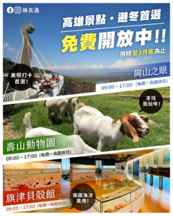 ▲延續高雄觀光熱潮 觀光局續推景點免費優惠 【焦點時報/記者蔡宗武】高雄市政府觀光局自109年10月1日起推出秋冬旅遊針對壽山動物園、崗山之眼及旗津貝殼館3大熱門景點免門票優惠措施以來,明顯吸引國內許多旅客前來高雄旅遊,現階段為後疫情時期,觀光局為延續這一波旅遊熱潮,振興觀光發展刺激民眾消費意願,續推3大景點自至110年3月底前免費入園優惠方案...... [閱讀更多]