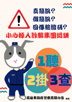 ▲防詐看板換新裝 兔子警探再出擊 【記者蔡宗武/高雄報導】近年來電信詐騙手法不斷翻新,為提醒市民防範,高雄市政府警察局除不時透過各種方法、管道宣導外,也在車水馬龍的中正四路警局側門懸掛大型宣導看板,更於近日為看板換新裝,推出由警察局小編自已設計的兔子警探圖卡,簡捷明快的構圖配上活潑生動的表情,使路過的民眾眼睛為之一亮。 市警局特別呼籲市民...... [閱讀更多]