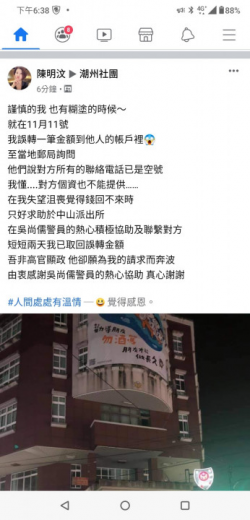 錢轉錯帳戶 潮警積極聯繫順利追回 獲民眾公開感謝【記者李堂安/屏東報導】屏東縣陳女誤將5萬元不慎轉入他人帳戶,經員警吳尚儒協助積極聯繫對方後順利追回匯錯帳戶的新台幣5萬元,陳女對警方的高效率及積極服務表示感謝,並在臉書「屏東縣潮州鎮」、「潮州社團」內公開表揚吳尚儒警員的辛勞。 屏東潮州分局中山路派出所警員吳尚儒、王峻胤執行巡邏勤務,接獲民眾陳女至所報案稱其誤將5萬元不慎轉...... [閱讀更多]