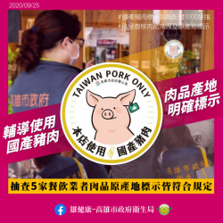 【記者蔡宗武/高雄報導】 衛生福利部已於109年9月17日公告自110年1月1日起所有直接供應飲食場所其供應食品之豬肉及豬可食部位原料,可於菜單或以立牌或其他標示方式揭露其原料之原產地(國)標示。本市為保障外食之消費族群能明確判斷餐飲業者使用之豬肉原產地,並鼓勵店家多多採用國產豬肉來做料理及製作產品,推廣國產豬肉及支持在地豬農,自109年9月8日起由農業局、衛...... [閱讀更多]