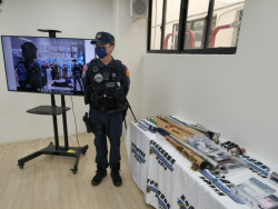 《圖說》臺中市警察局執行全國性的「防制幫派公開活動臨檢及掃黑行動專案」,在七日於刑警大隊地下一樓召開成果說明記者會,由大隊長林明佐主持,警方自三月份迄今展開掃黑行動,動員二千六百多名警力,執行搜索臨檢六百四十二個處所,查獲涉及組織犯罪之治平專案目標十件五十人,查獲非法槍械案六件六人、重大毒品案七件八人、詐欺車手八十五人、向上溯源查獲詐欺集團卅一件二百零二人;查扣各式槍枝十枝、各式子彈八...... [閱讀更多]